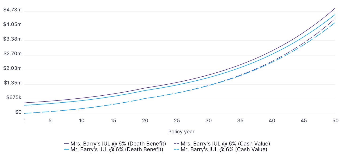 - Initial Death Benefit: $2.6M (assuming a 6% return).
