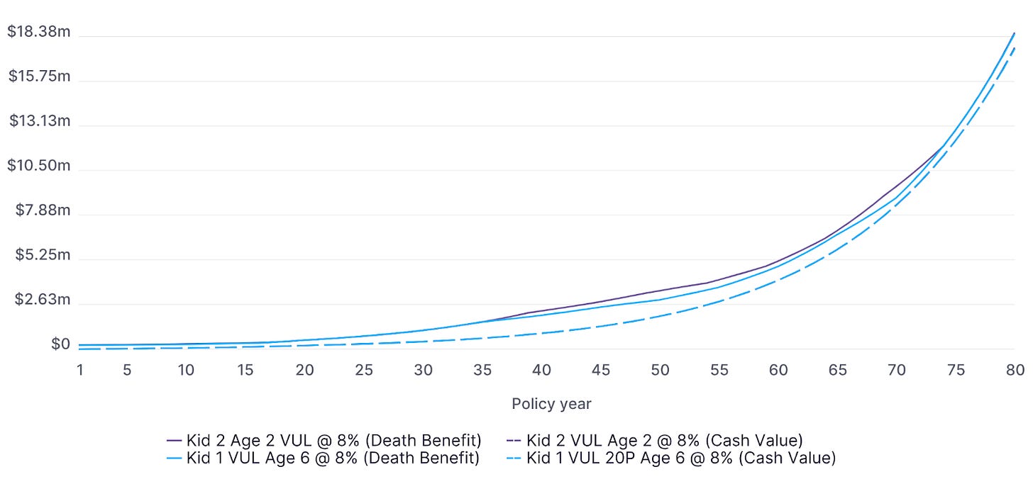 The two 20-Pay VUL Policies on the Children were tailored for longer-term growth and substantial potential upside. Taking out policies on their young children capitalized on the low cost of insuring children of that age so that by the time they were adults, there would be a substantial tax-advantaged pool of wealth they could access tax-free. They could choose to use the funds to purchase their first house, start a business, or simply have the peace of mind that they were already protected when they themselves decided to have children of their own.